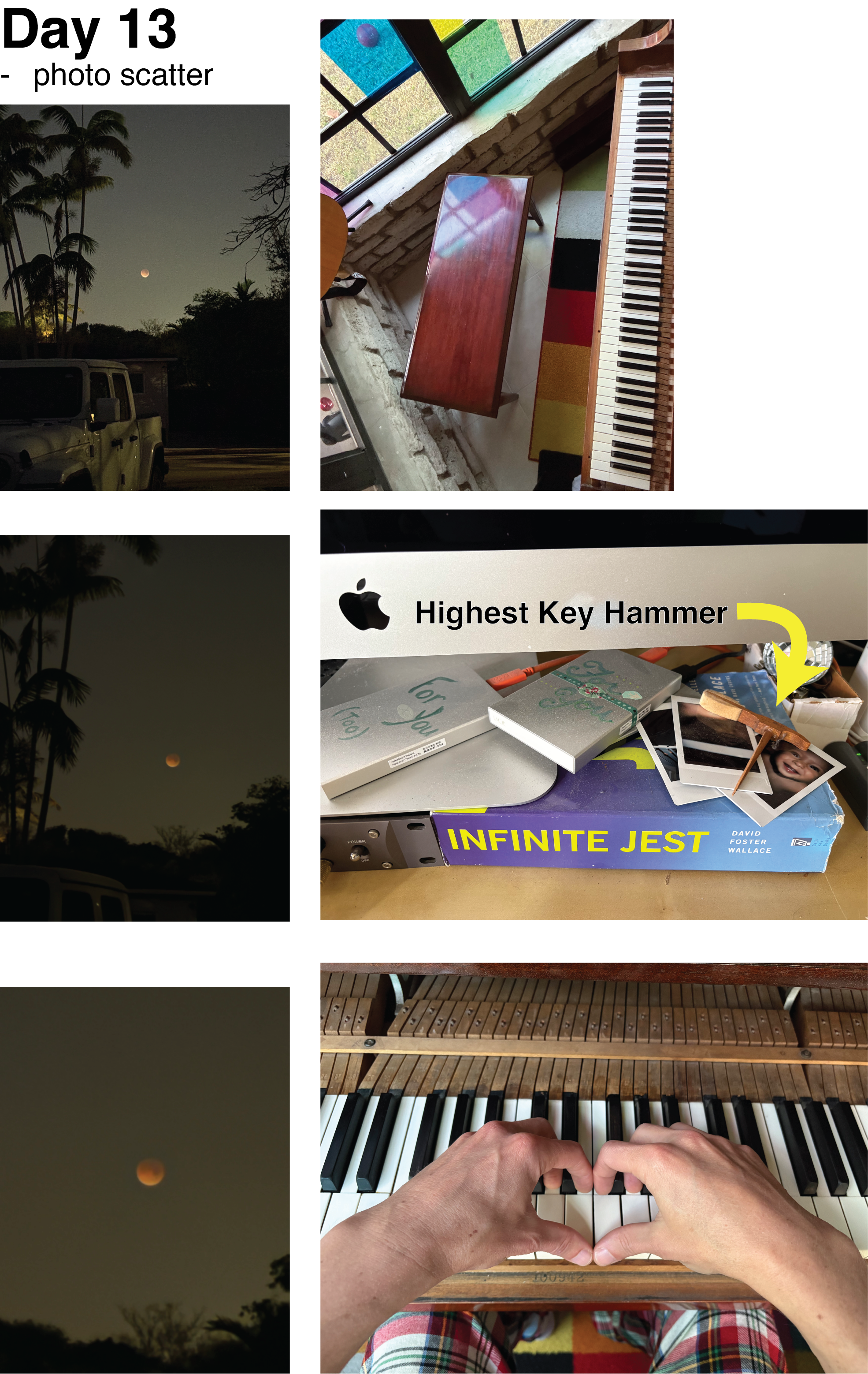 What if I just sit at the paino & try not to move at for as long as I can? Hold still certain playing poses on the keyboard & pedals. The journal entry could be titled: Stillness