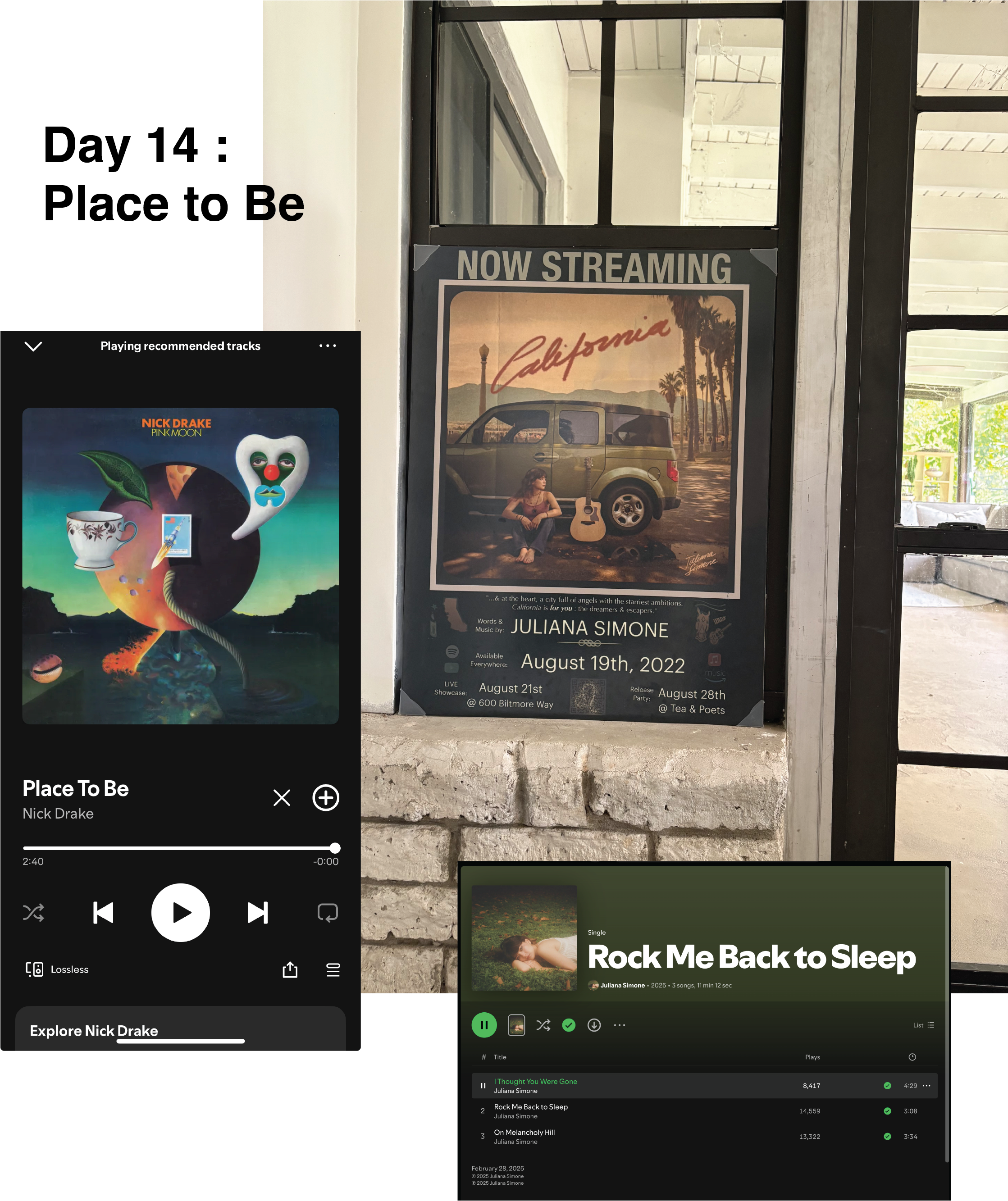 My eyes open on the lit phone resting on the Vose’s music stand in front of me. The phone displays the cover & title of the last song. Nick Drake’s “Place to Be”.
