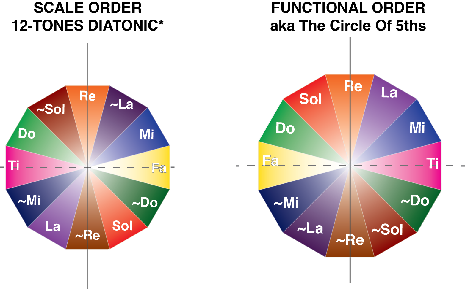 Then explain: "They're the same 12-tone diatonic system, but functional order reveals the Ti/Fa generation"